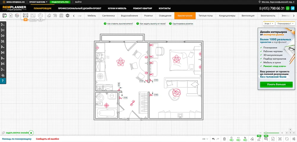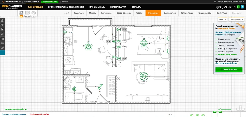 Онлайн-сервис для профессиональных ремонтных фирм и домашних строителей. Прямо в браузере вы можете продумать расстановку мебели и подведение коммуникаций. Remplanner удобно использовать как программу для проектирования освещения – предусмотрены отдельные вкладки для размещения выключателей, светильников, простых и силовых розеток, схемы электропроводки. Также можно подготовить развертки стен для учета расстояния между выводами кабелей по отношению к другим элементам.