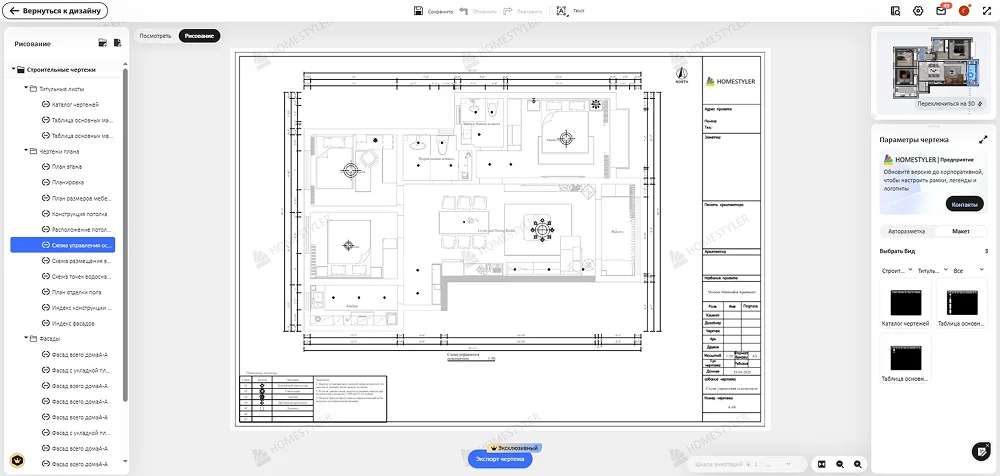 Онлайн-программа для создания профессиональных 2D-планов и 3D-визуализации квартир и малоэтажных домов. После обновления в Homestyler появилась функция генерации строительных чертежей, включающих листы с расположением электроустановочного оборудования. Достаточно разместить на плане светильники и технику, ИИ автоматически выберет оптимальное расположение выключателей и розеток.