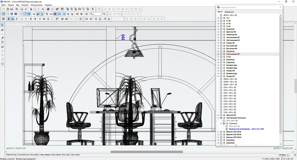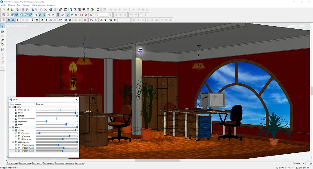 ПО для проектирования мебели и интерьеров подходит и для световых решений. Поддерживает настройку распределения света, регулировку потоков и цветовой температуры. Хотя для полноценной проектировки коммуникаций PRO100 не подходит, это отличная программа для дизайна освещения. Можно без труда продумать, как расположить люстры и бра, и оценить, как будет смотреться интерьер с разными сценариями, где разместить дополнительные источники.