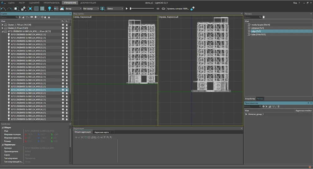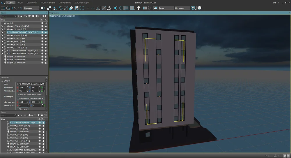 Комплекс состоит из двух программ – для светотехнических расчетов и проектирования, а также управления освещением на архитектурных объектах в автоматическом и ручном режиме. LightCAD позволяет расставлять коммутационные аппараты, учитывать защиту и нагрузки. ПО упрощает работу с масштабными проектами благодаря автоматизации создания схем проводок, групповых линий и спецификаций.