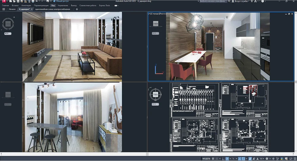 Одна из самых распространенных CAD-программ предлагает расширенные возможности для проектирования зданий и интерьеров. В ней можно детально прорабатывать световые сценарии и составлять электросхемы с помощью модуля «Electrical» и дополнительных плагинов от Autodesk. Результат красиво визуализируется в 3D и видеопанорамы с обзором 360°.
